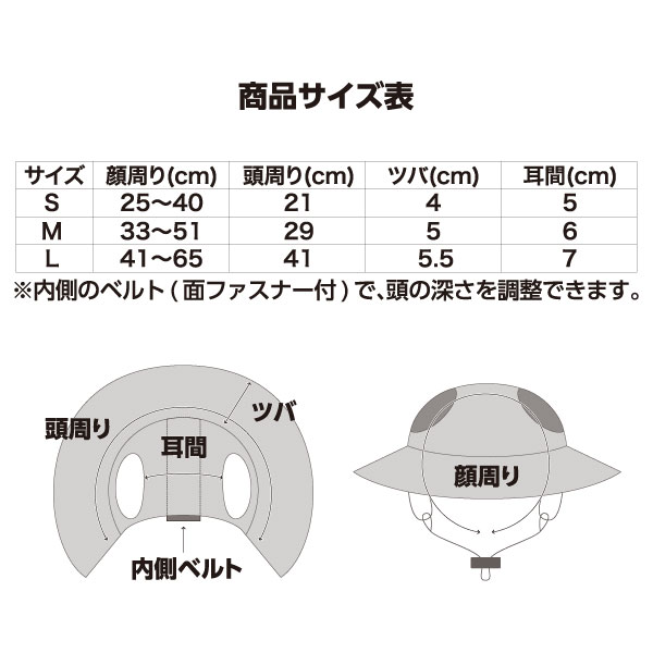 Sサイズ:顔回り 約25~40cm 頭回り 約21cm ツバ 約4㎝ 耳間 約5cm